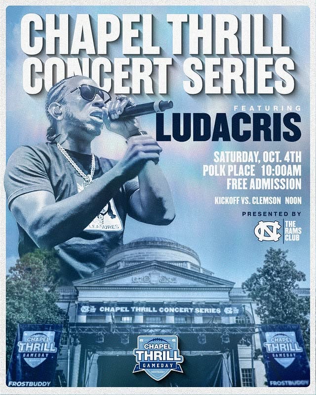 That noon kickoff means if you’re attending the pre-game Ludacris concert in Polk Place, it will begin at 10:00 a.m. (free admission). This has to be the earliest show he’s ever done, and I’m interested to see what “family friendly” tweaks he makes to his lyrics. So, be there for “Breakfast with Luda” on Oct. 4.