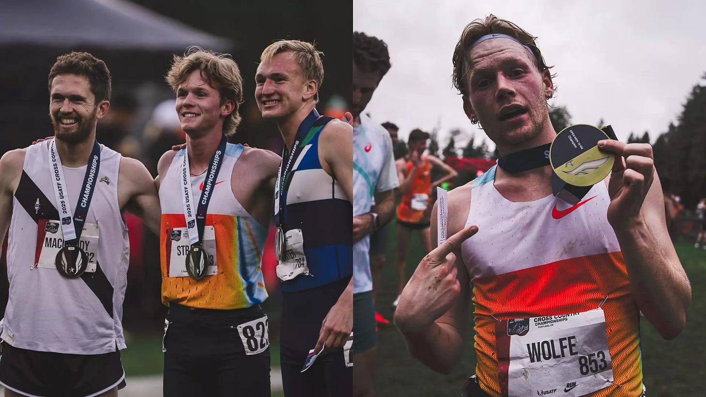 Wolfe claimed his first national title as a professional athlete, winning the 10k at the 2025 XC Championships over the weekend. His time for the 6.2-mile race was 29:16…on a wet, muddy, hilly golf course 😲