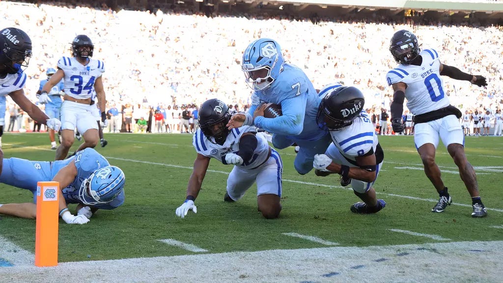 On a brighter note, UNC quarterback Gio Lopez (21-of-27, 204 yards, 1 TD passing, 1 TD rushing) outplayed highly regarded Duke quarterback Darian Mensah (20-of-33, 175 yards, 1 TD) despite taking numerous big hits throughout the game.