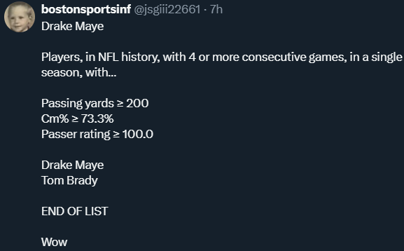 Drake Maye and the Patriots handed the Bills their first loss with a huge 23-20 road victory. Maye was nearly flawless, completing 22 of 30 passes for 273 yards.