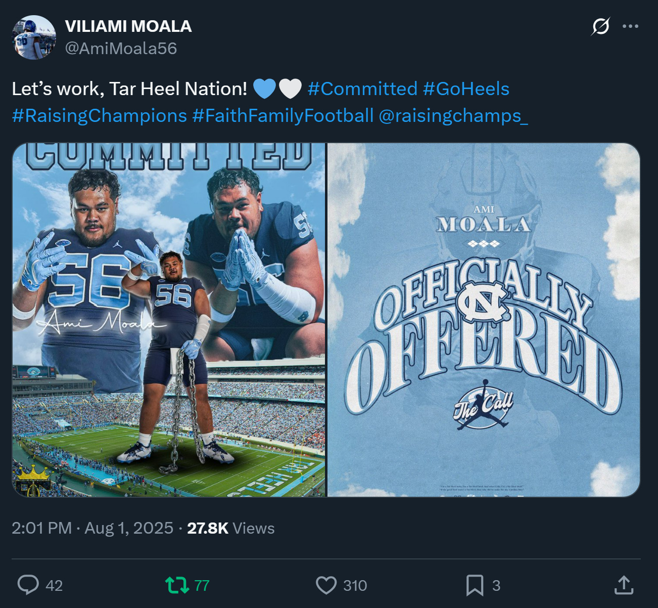 There were two huge football commitments on Friday and one more on Sunday. Former Oregon and USC Defensive Line Pledge Viliami Moala committed to UNC on Friday. He’s listed at 6-foot-2, 340 pounds!