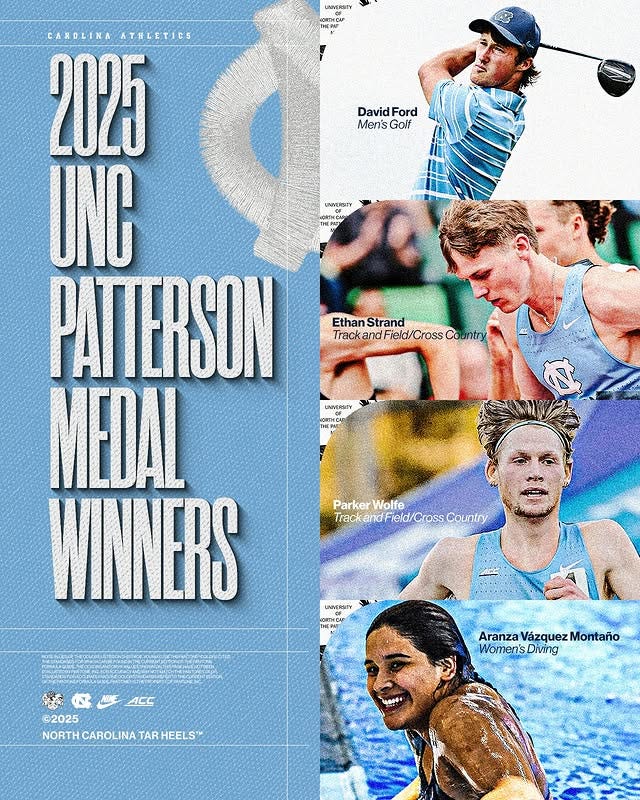 Congratulations to David Ford, Aranza Vázquez Montaño, Ethan Strand, and Parker Wolfe, who were named recipients of the 2024-25 Patterson Medal, UNC Athletics’ most prestigious award. Strand also just earned a spot in the 1,500m World Championships in Tokyo: