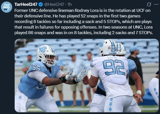 Another transfer, former UNC defensive lineman Rodney Lora will line up against the Tar Heels for UCF on Saturday afternoon.