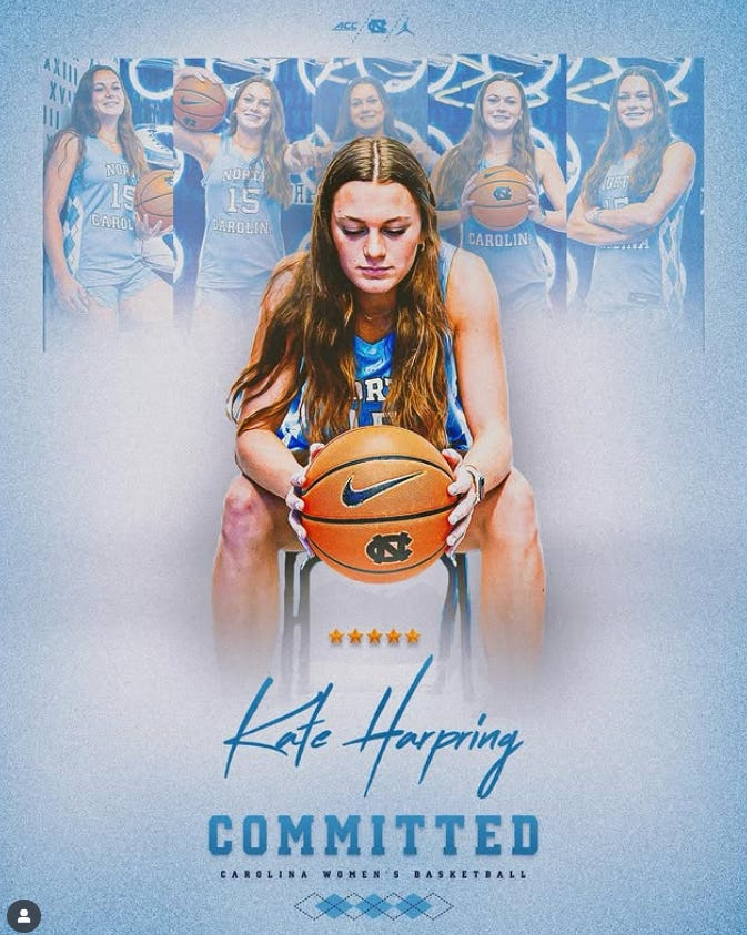 On Saturday, Courtney Banghart got some HUGE news when Kate Harpring, the No. 1-ranked player in the 2026 class, committed to the Tar Heels over South Carolina, Iowa, UCLA, and others. Harpring is a 5-star wing and the daughter of former Georgia Tech great and NBA veteran Matt Harpring.