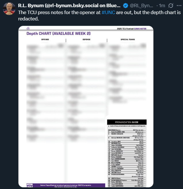 In other personnel matters, Bill Belichick is not the only secretive coach entering Monday night’s primetime matchup. TCU put out a depth chart that looks like this 😂